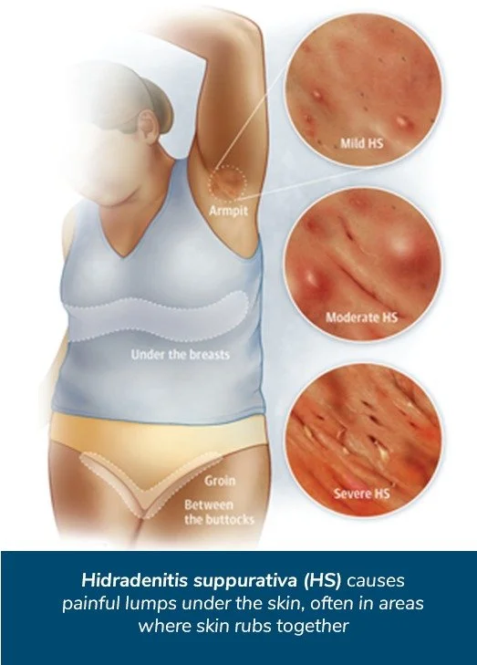 Hidradenitis suppurativa (HS), or acne inversa, is a skin condition that causes painful bumps, boils and/or abscesses to form under the skin. HS usually appears in areas where skin rubs together, such as the armpits, groin, inner thighs, buttocks and breasts. As HS gets more severe, these bumps, boils and/or abscesses grow deeper, and can rupture or leak and cause scarring.